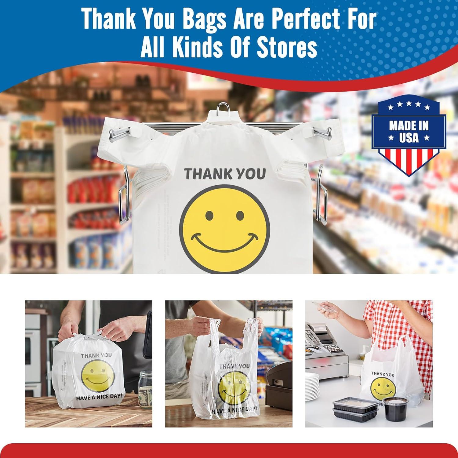 Fuxury 1000 Count Thank You Plastic Bags (12" x 6.5" x 21") White, T-shirt, Grocery, Take Out, To Go, Retail Shopping Bags in Bulk (Made in USA)(White Smile)