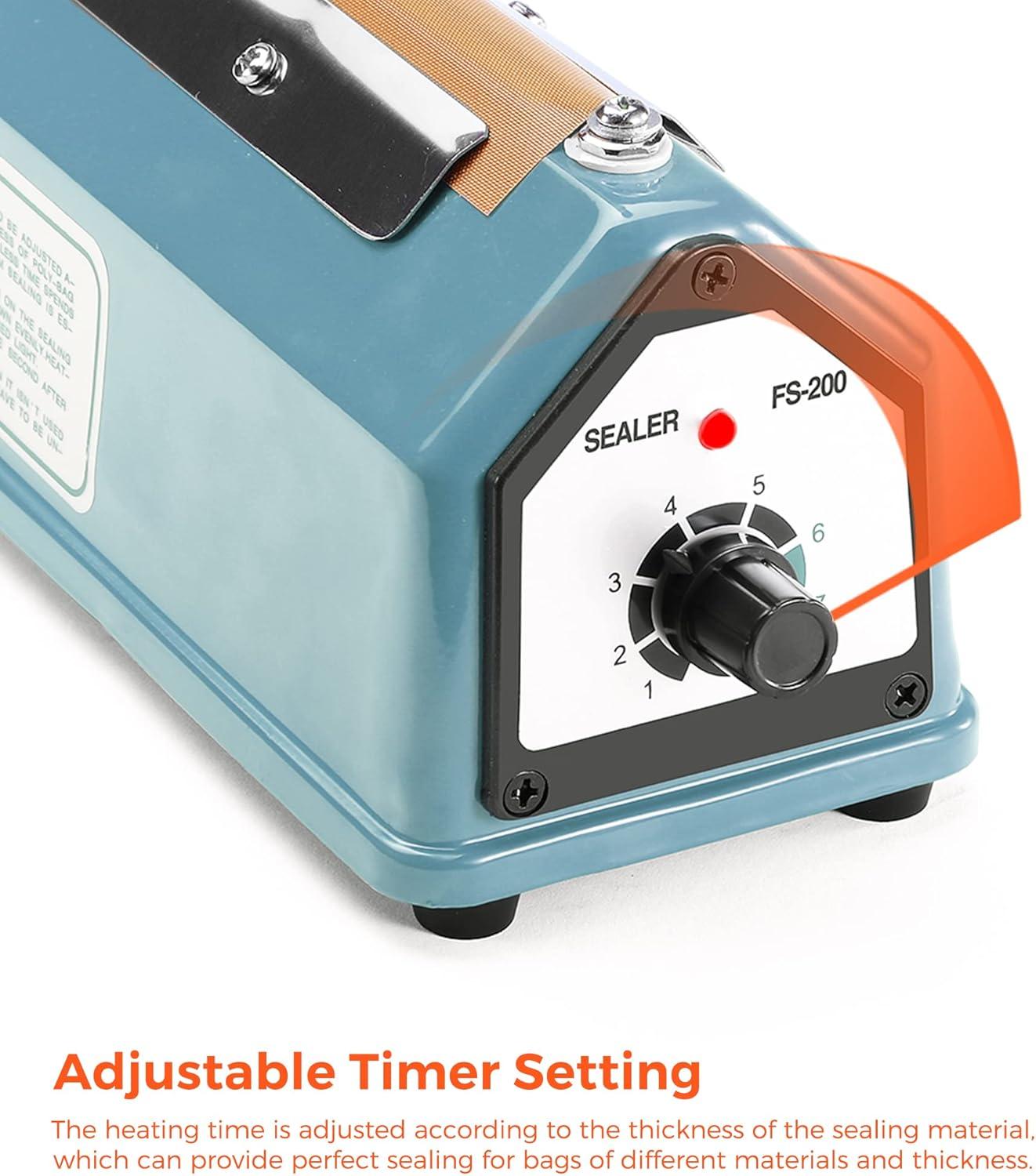 【Professional Heat Sealer】Fuxury impulse bag sealer precision electronic control circuit to controls the time and the heat automatically.The heat sealer compact size: 8 inch(200mm)Seal length, 2mm sealing width, metal quality and double paint, stability and good rust effect. Bag sealer equipment includes 2 replacement kits.