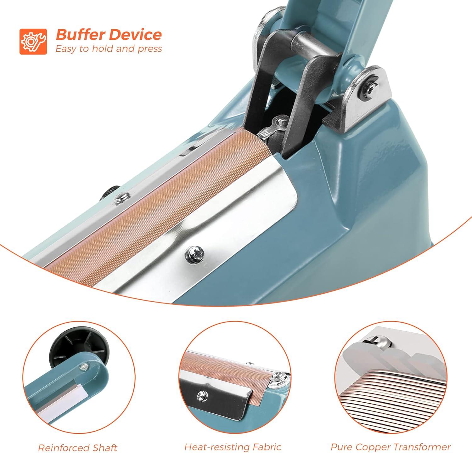 【No Warm Up-time Required】No warm up or cooldown time needed.Bag sealer is safe and simple to use,and it can be used immediately.The heat sealer only heats up when the arm is down and in contact with the material and the base,it can safe your business time and money.